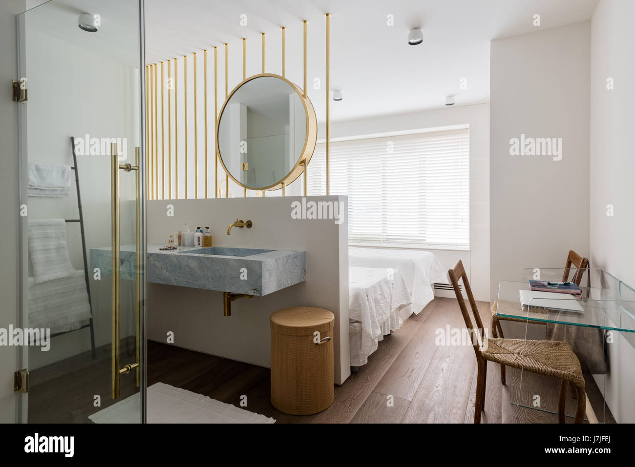 Come realizzare una camera da letto con bagno. La mattina, ad esempio, può risolvere numerosi situazioni, quando i bambini devono correre a scuola e i genitori a lavoro. Una bella camera da letto che si apra a un moderno bagno diviso da una vetrata glamour, chi non la vorrebbe? Il bagno in camera da letto ha un fascino unico, in più se si ha una famiglia numerosa si rivela essere estremamente funzionale. Immaginate lo stupore di amici e parenti che entrando nella vostra camera da letto con annesso bagno, non potranno fare altro che sgranare gli occhi. Un arredo elegante e semplice, che ti permetterà di giocare con dettagli e accessori. Entrando in bagno notiamo che anche qui si è scelto una doccia a pavimento, sfruttando opportunamente uno degli angoli dell'ambiente.
