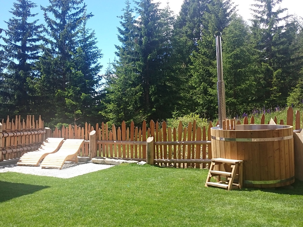Tinozza Bagno. Tinozze in legno a botte per ambienti esterni ed interni. Fare il bagno in mezzo alla natura, tra i boschi di larice, con una vista imprendibile sul sosto e la diga del Luzzone.